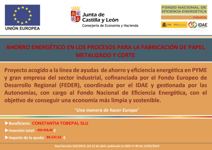 Gracias a la financiación de la Unión Europea y el Fondo Nacional de Eficiencia Energética (IDAE) se han conseguido los resultados para lograr el ahorro energético en los procesos de metalización y corte.