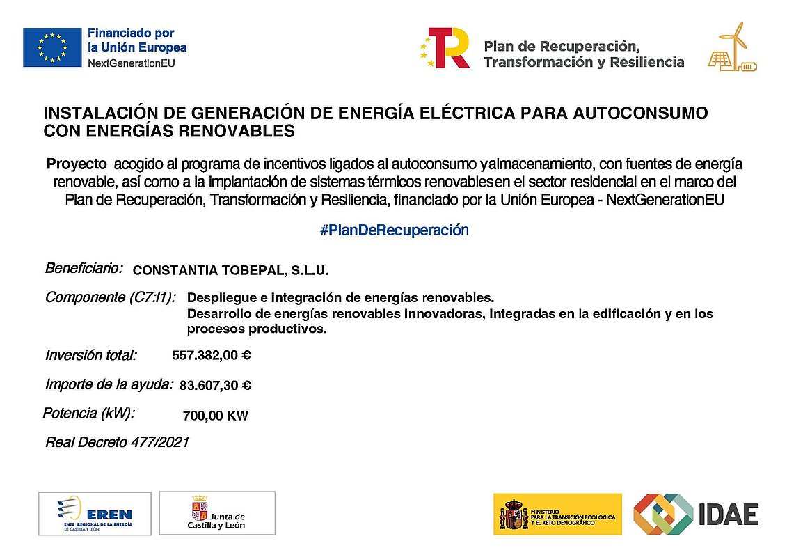 En Constantia Tobepal, S.L.U. seguimos avanzando en nuestro compromiso con la sostenibilidad y la eficiencia energética. Hemos completado la instalación de un sistema de generación eléctrica para autoconsumo mediante energía solar fotovoltaica, una iniciativa que contribuye a la reducción de emisiones y a la optimización de nuestros costes energéticos.
